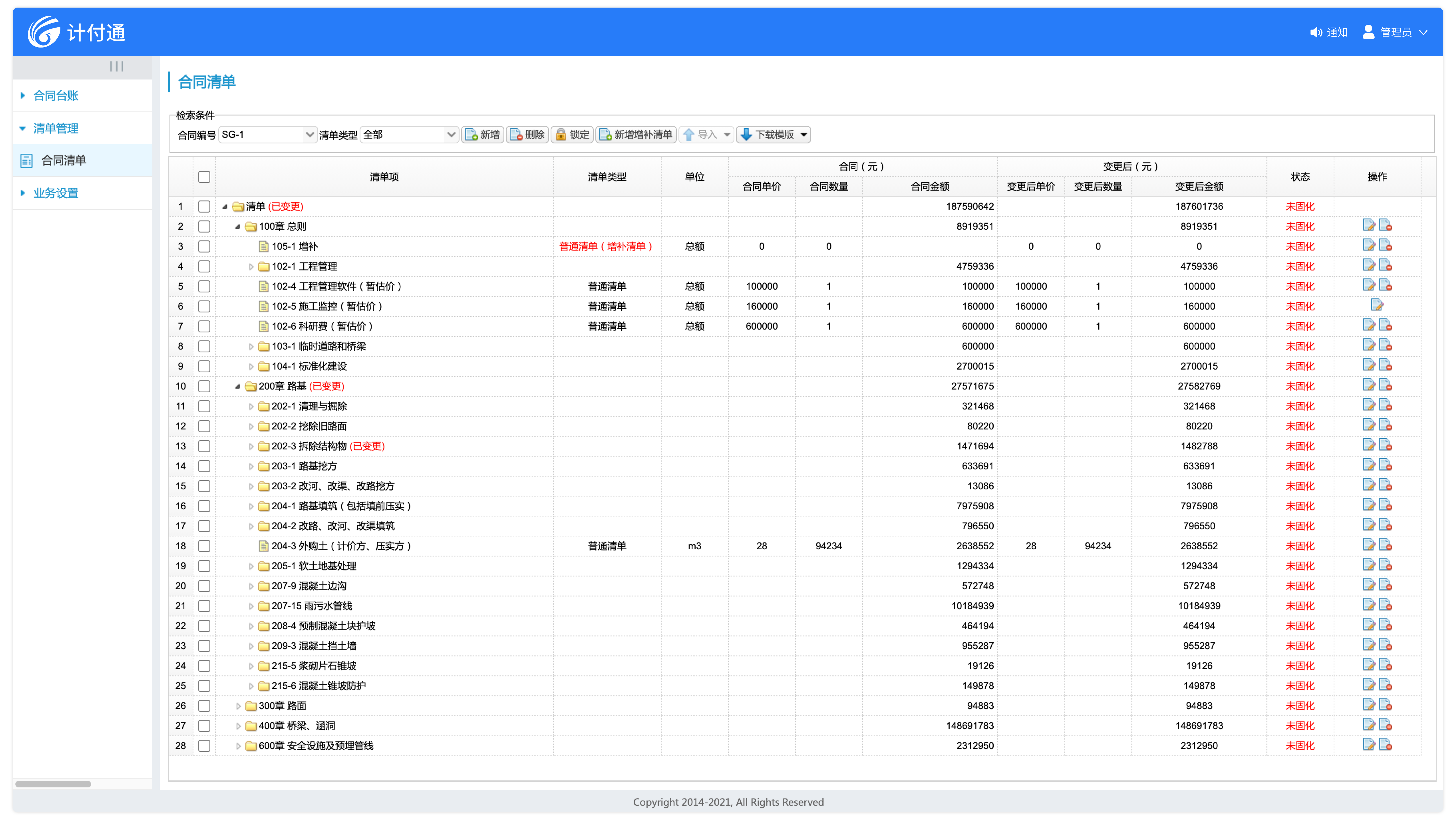合同清單支持公路、房建、市政、水運、航道等不同項目類型的工程量清單,提供標準模板,支持清單導入導出。